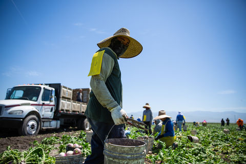 - Ramiro, farm worker from Oaxaca, harvesting turnips in Delano, CA.